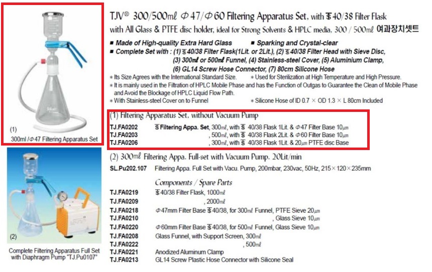 올 글래스 & PTFE 디스크 홀더 포함, 스트롱 솔벤트 & HPLC 배지에 이상적, 300/500ml