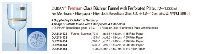 듀란? 프리미엄 유리 부흐너 깔때기, 천공 플레이트, 70~1,000ml