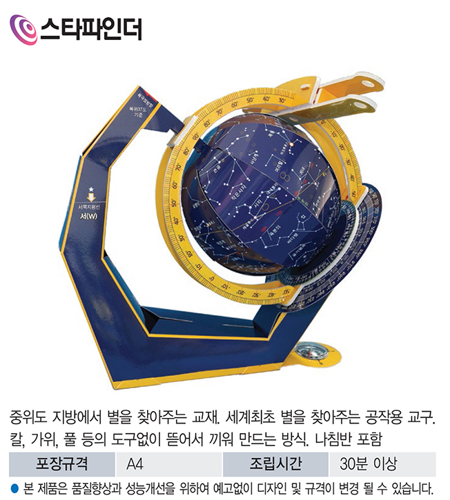 개요 : 중위도 지방에서 별을 찾아주는 교재. 세계최초 별을 찾아주는 공작용 교구. 칼, 가위, 풀 등의 도구 없이 뜯어서 끼워 만드는 방식. 나침반 포함