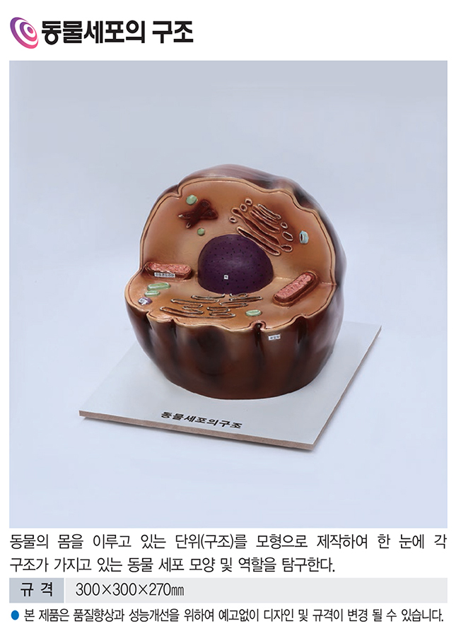 품명 코드번호 : VLS-6059 품명 : 동물세포의 구조 개요 : 동물의 몸을 이루고 있는 단위(구조)를 모형으로 제작하여 한 눈에 각 구조가 가지고 있는 동물 세포 모양 및 역할을 탐구한다.