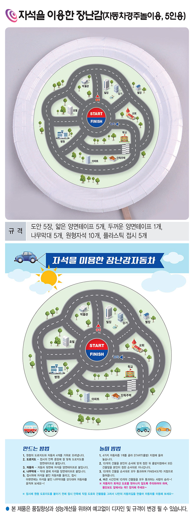 품명 자석의 원리로 자동차를 움직이며 놀이와 학습을 동시에 할 수 있는 자석 장난감 자동차 만들기 세트입니다. 원형 도로판과 구성품이 포함되어 과학수업과 창의체험 활동에 적합한 5인용 키트입니다.