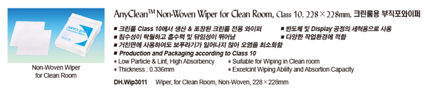 AnyCleanTM Non-Woven Wiper for Clean Room, Class 10, 228×228mm, 크린룸용 부직포와이퍼