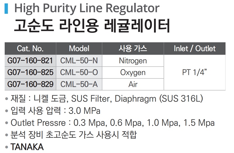 품명 ■ 재질 : 니켈 도금, SUS Filter, Diaphragm (SUS 316L) ■ 입력 사용 압력 : 3.0 MPa ■ Outlet Pressre : 0.3 Mpa, 0.6 Mpa, 1.0 Mpa, 1.5 Mpa ■ 분석 장비 초고순도 가스 사용시 적합 ■ TANAKA