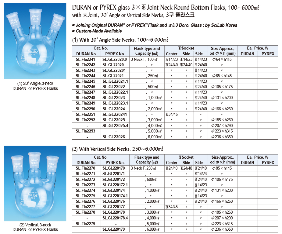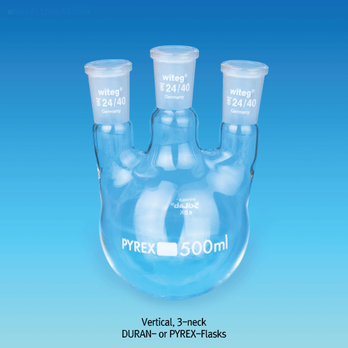 DURAN or PYREX glass 3× Joint Neck Round Bottom Flasks, 100~6000㎖ with Joint, 20°Angle or Vertical Side Necks