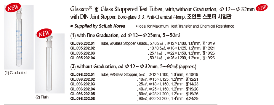 Glassco® Glass Stoppered Test Tubes, with/without Graduation, Φ12~Φ32mm with DIN Joint Stopper, Boro-glass 3.3, Anti-Chemical /-Temp