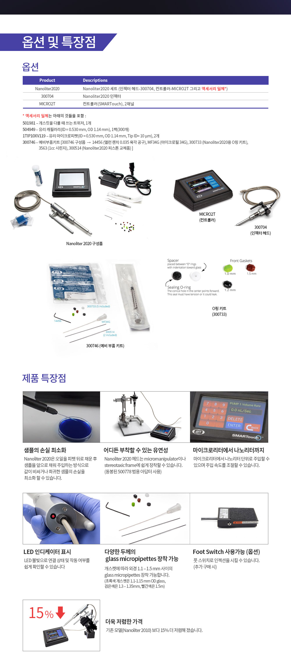 품명 유리 마이크로 피펫을 펌프 끝에 삽입하여 나노 리터 단위의 주입이 가능