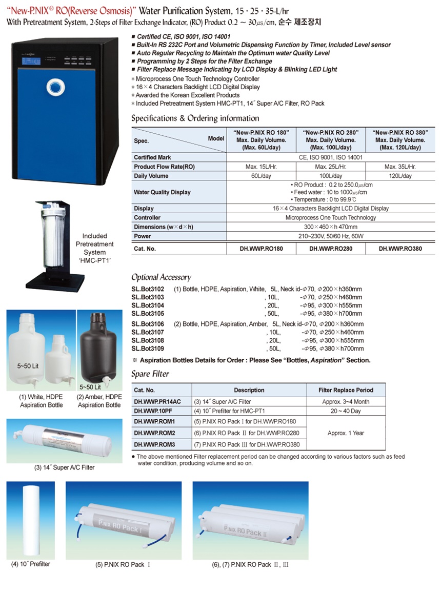 “New-P.NIX® RO(Reverse Osmosis)” Water Purification System, 15·25·35-L/hrWith Pretreatment System, 2-Steps of Filter Exchange Indicator, (RO) Product 0.2 ~ 30㎲/cm, 순수 제조장치
