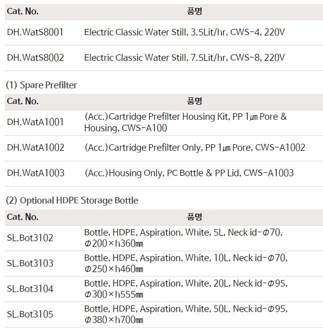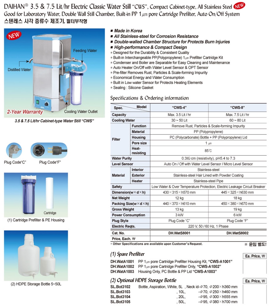 DAIHAN® 3.5 & 7.5 Lit/hr Electric Classic Water Still “CWS”, Compact Cabinet-type, All Stainless Steel Good for Laboratory Water, Double Wall Still Chamber, Built-in PP 1㎛ pore Cartridge Prefilter, Auto On/Off System 스텐레스 사각 증류수 제조기, 필터부착형