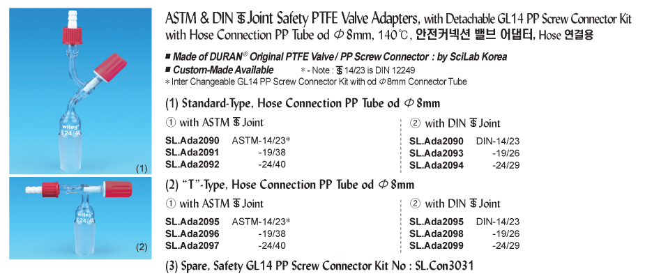 ASTM & DIN Joint Safety PTFE Valve Adapters, with Detachable GL14 PP Screw Connector Kit with Hose Connection PP Tube od Φ8mm, 140℃