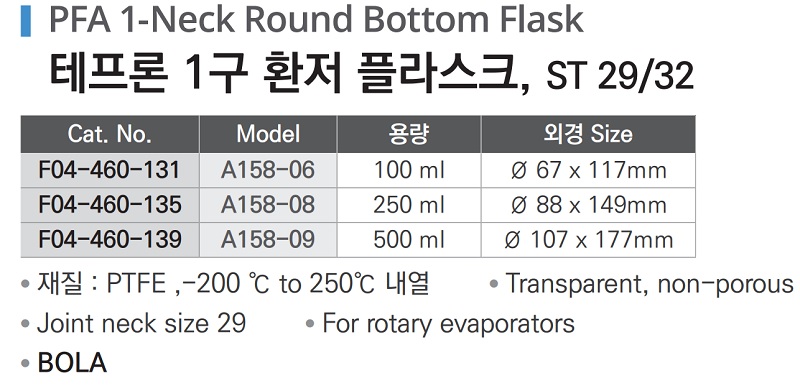 품명 ■ 재질 : PTFE ,-200 ℃ to 250℃ 내열 ■ Transparent, non-porous ■ Joint neck size 29 ■ For rotary evaporators ■ BOLA