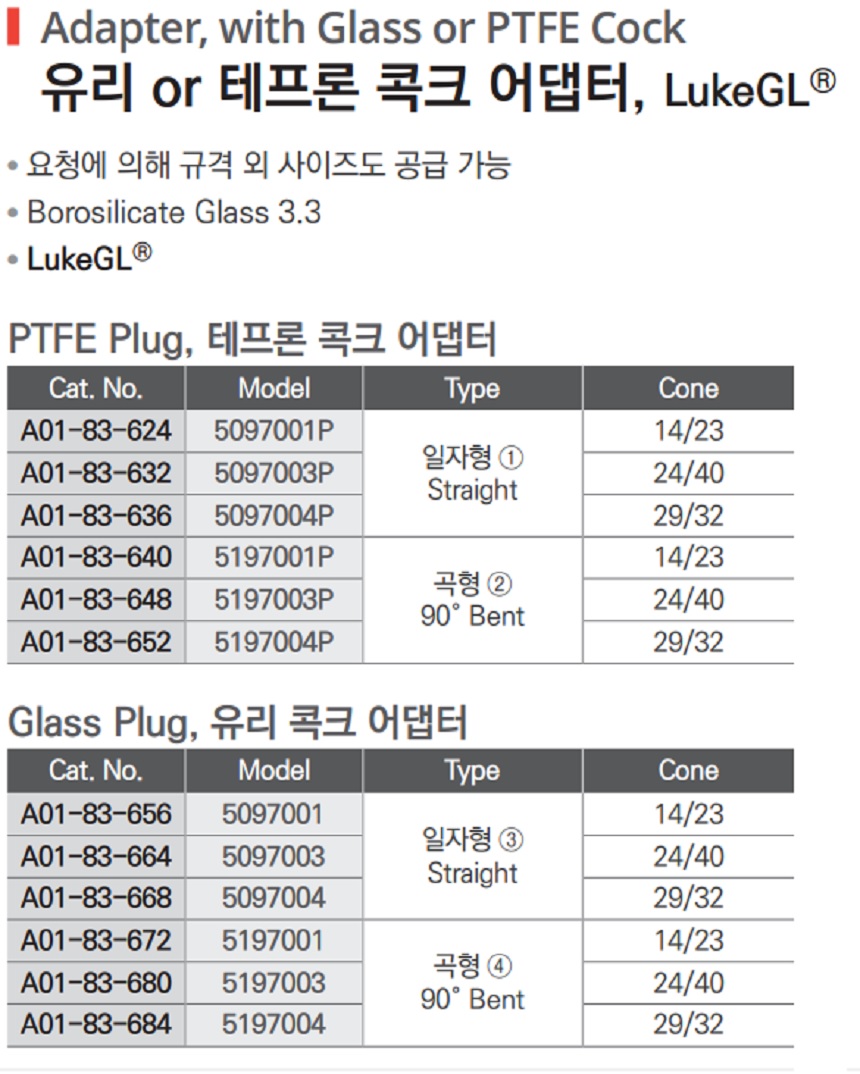 유리 or 테프론 콕크 어댑터 Adapter, with Glass or PTFE Cock, A01-83-624