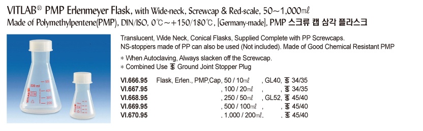 VITLAB® PMP Erlenmeyer Flask, with Wide-neck, Screwcap & Red-scale, 50~1,000㎖Made of Polymethylpentene(PMP), DIN/ISO, 0℃~+ 1 50/ 1 80℃, [ Germany-made ] , PMP 스크류 캡 삼각 플라스크