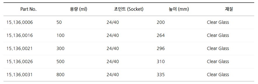 24/40 규격의 접지 조인트가 적용되어 응축기나 장치와 쉽게 연결되며, 기밀성이 높아 실험 정확도를 확보할 수 있습니다.