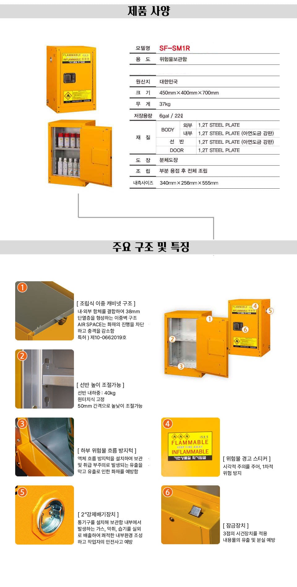 품명 실험실 및 산업현장용 6갤런 위험물보관함, 이중구조 및 배기장치로 안전성 강화. SF-SM1R 모델 소개.
