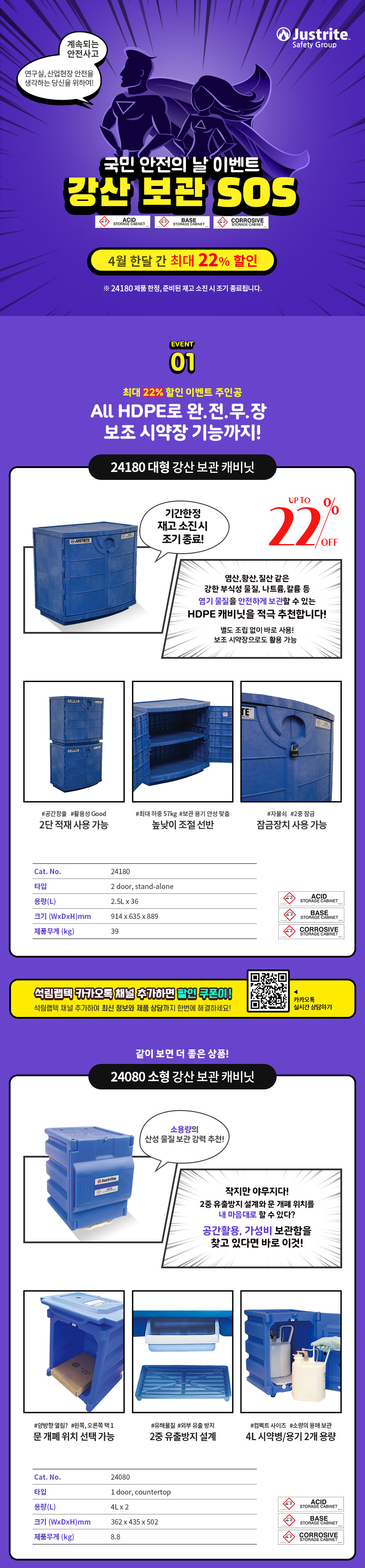 품명 코드번호 : 24180 대형 품 명 : 산/부식성 물질보관 안전 캐비닛 특 징 : * 문 개폐 위치 선택 가능 * 2중 유출방지 설계