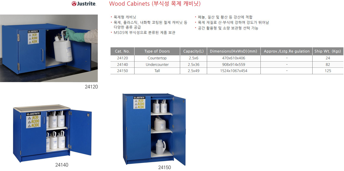 품명 코드번호 : 24140 품 명 : 산/부식성 물질보관 안전 캐비닛 특징 : * 공간 활용형 및 소량 보관형 선택 가능* 목제 재질로 산.부식에 강하며 강도가 뛰어남