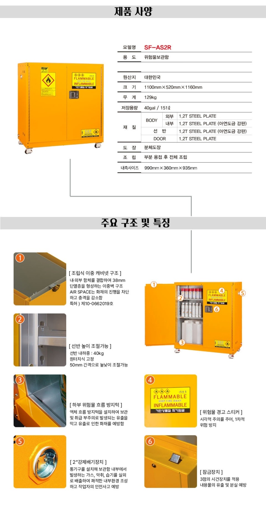 품명 40갤런 위험물보관함, 이중벽 내화 구조와 강제배기장치로 화재 위험을 줄인 안전 인증 보관장입니다.