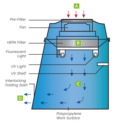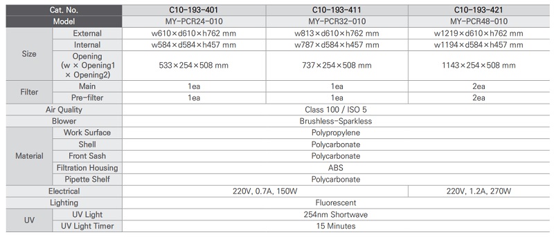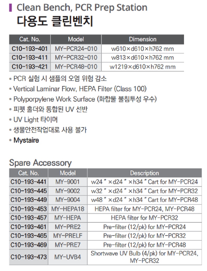 품명 ■ PCR 실험 시 샘플의 오염 위험 감소 ■ Vertical Laminar Flow, HEPA Filter (Class 100) ■ Polyporpylene Work Surface (화합물 불침투성 우수) ■ 피펫 홀더와 통합된 UV 선반 ■ UV light 타이머 ■ 생물안전작업대로 사용 불가 ■ Mystaire