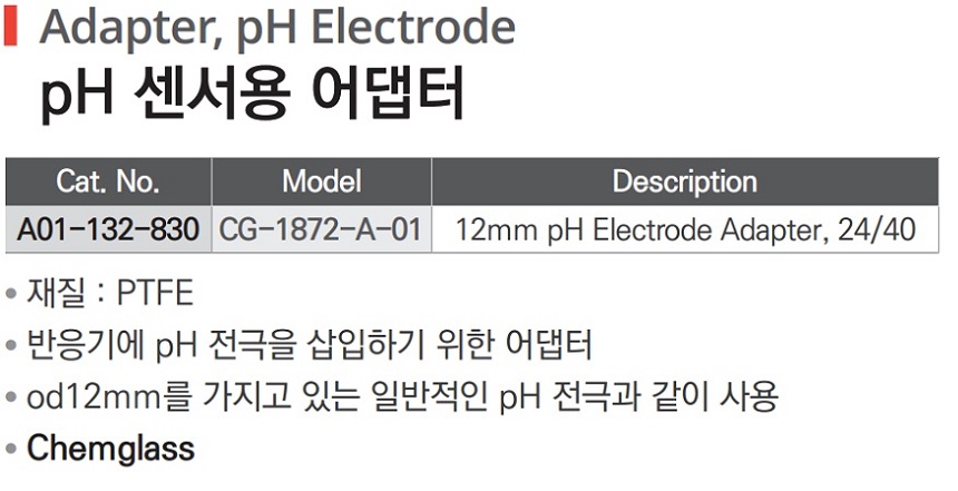 ■ 주요특징재질 : PTFE반응기에 pH 전극을 삽입하기 위한 어댑터od12mm를 가지고 있는 일반적인 pH 전극과 같이 사용