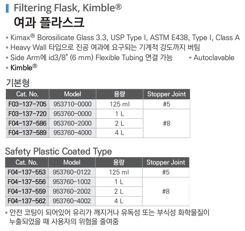 품명 ■ Borosilicate Glass 3.3, USP Type Ⅰ, Class A ■ Heavy Wall 타입으로 진공 여과에 요구되는 기계적 강도까지 버팀 ■ Side Arm에 ID3/8" (6 mm) Flexible Tubing 연결 가능 ■ Autoclavable ■ Kimble®