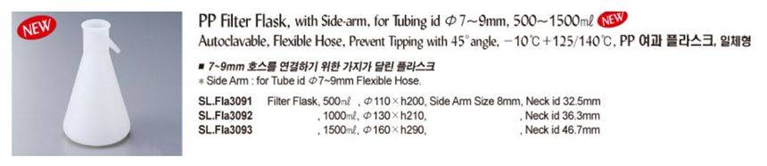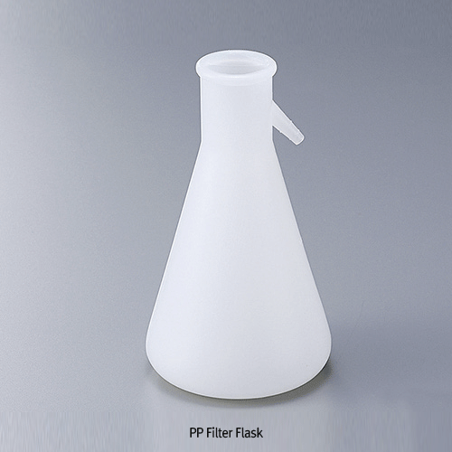 PP Filter Flask, with Side-arm, for Tubing id Φ7~9mm, 500~1500㎖Autoclavable, Flexible Hose, Prevent Tipping with 45°angle, -10℃+125/140℃, PP 여과 플라스크, 일체형