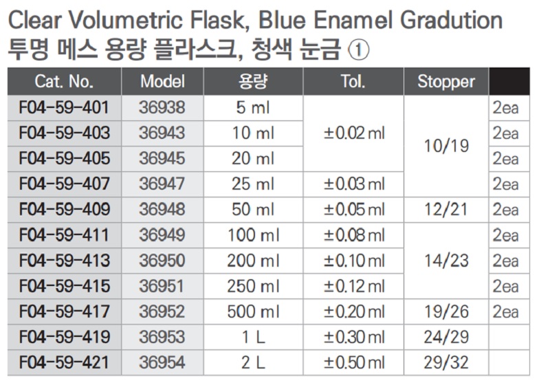 Clear Volumetric Flask, Blue Enamel Gradution / 투명 메스 용량 플라스크, 청색 눈금 ①| Cat. No | Model | 용량 | Tol. | Stopper |