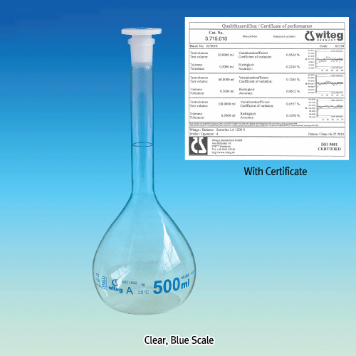 Witeg® Premium A-class Batch Certificated Volumetric Flask, Clear & Amber-glass, 5~5,000㎖Amber & Blue Graduation in Clear Glass, DIN/ISO, DE-M, [ Germany-made ]
