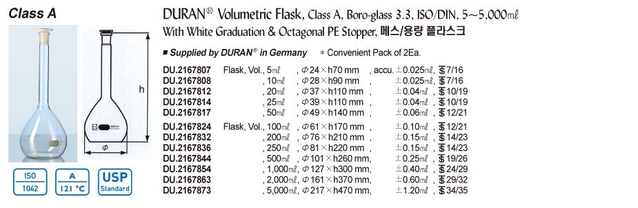 DURAN® Volumetric Flask, Class A, Boro-glass 3.3, ISO/DIN, 5~5,000㎖With White Graduation & Octagonal PE Stopper