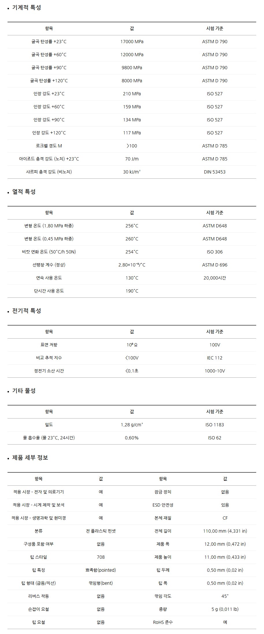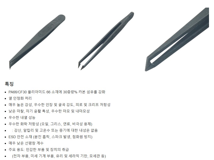 높은 강성과 인장·굴곡 강도, 내마모성과 내열성을 갖추어 정밀 전자부품 및 민감한 실험기기 작업에 적합합니다.
