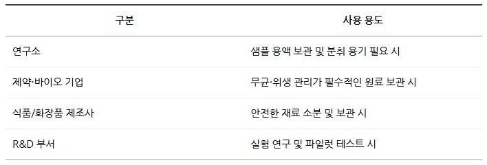 연구소, 제약, 식품, 화장품, R&D 분야에서 샘플 보관, 혼합, 소분, 이송 등의 다양한 용도로 활용됩니다.