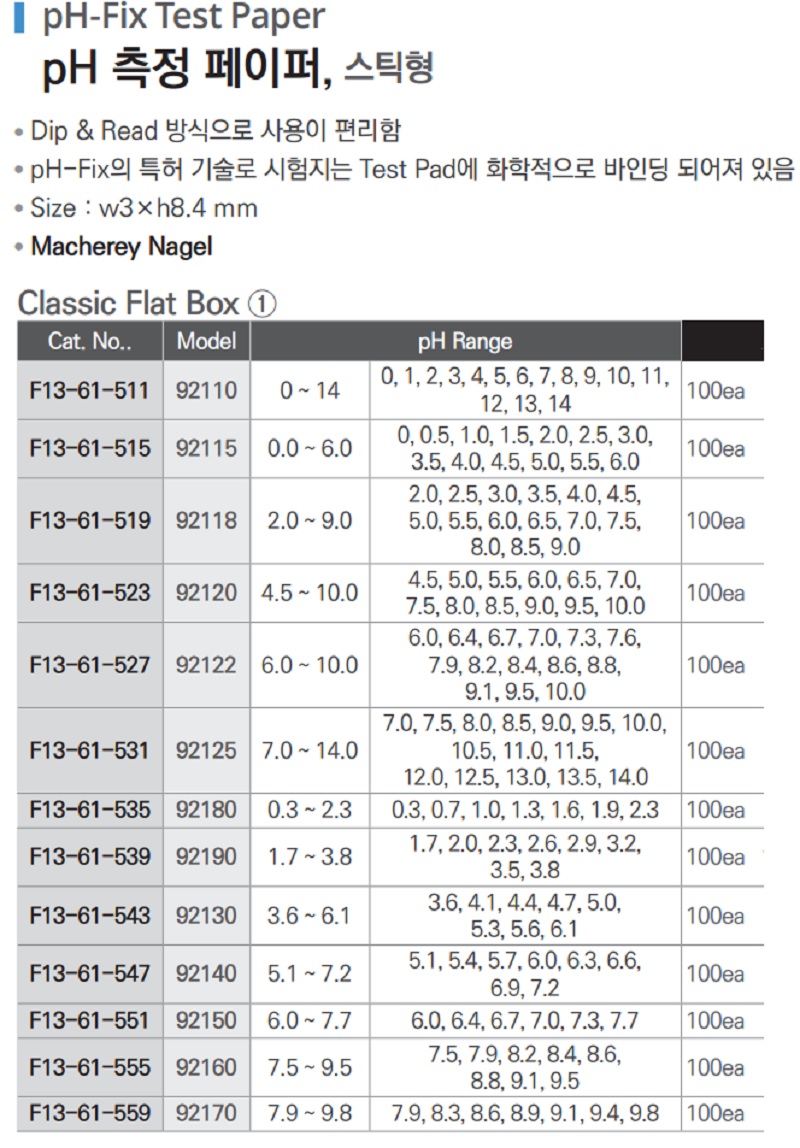품명 ■ Dip & Read 방식으로 사용이 편리함 ■ pH-Fix의 특허 기술로 시험지는 Test Pad에 화학적으로 바인딩 되어져 있음 ■ Paper Size : w3×h8.4 mm ■ Macherey Nagel