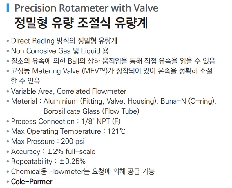 품명 ■ Direct Reding 방식의 정밀형 유량계 ■ Non Corrosive Gas 및 Liquid 용 ■ 질소의 유속에 의한 Ball의 상하 움직임을 통해 직접 유속을 읽을 수 있음 ■ 고성능 Metering Valve (MFV™)가 장착되어 있어 유속을 정확히 조절 할 수 있음 ■ Variable Area, Correlated Flowmeter ■ Meterial : Aluminium (Fitting, Valve, Housing), Buna-N (