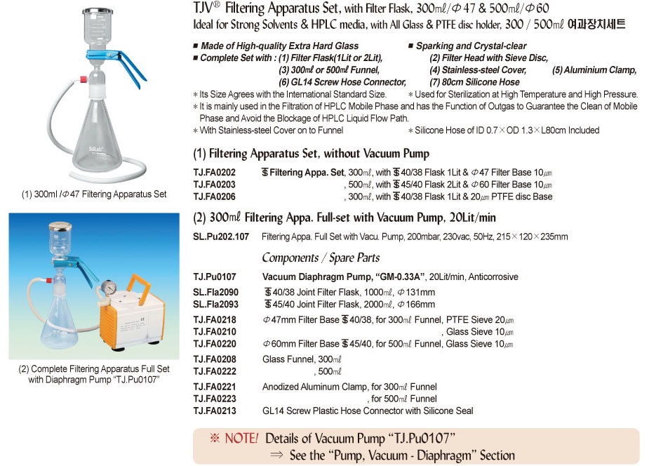 TJV® Filtering Apparatus Set, with Filter Flask, 300㎖/Φ47 & 500㎖/Φ60Ideal for Strong Solvents & HPLC media, with All Glass & PTFE disc holder, 300 / 500㎖