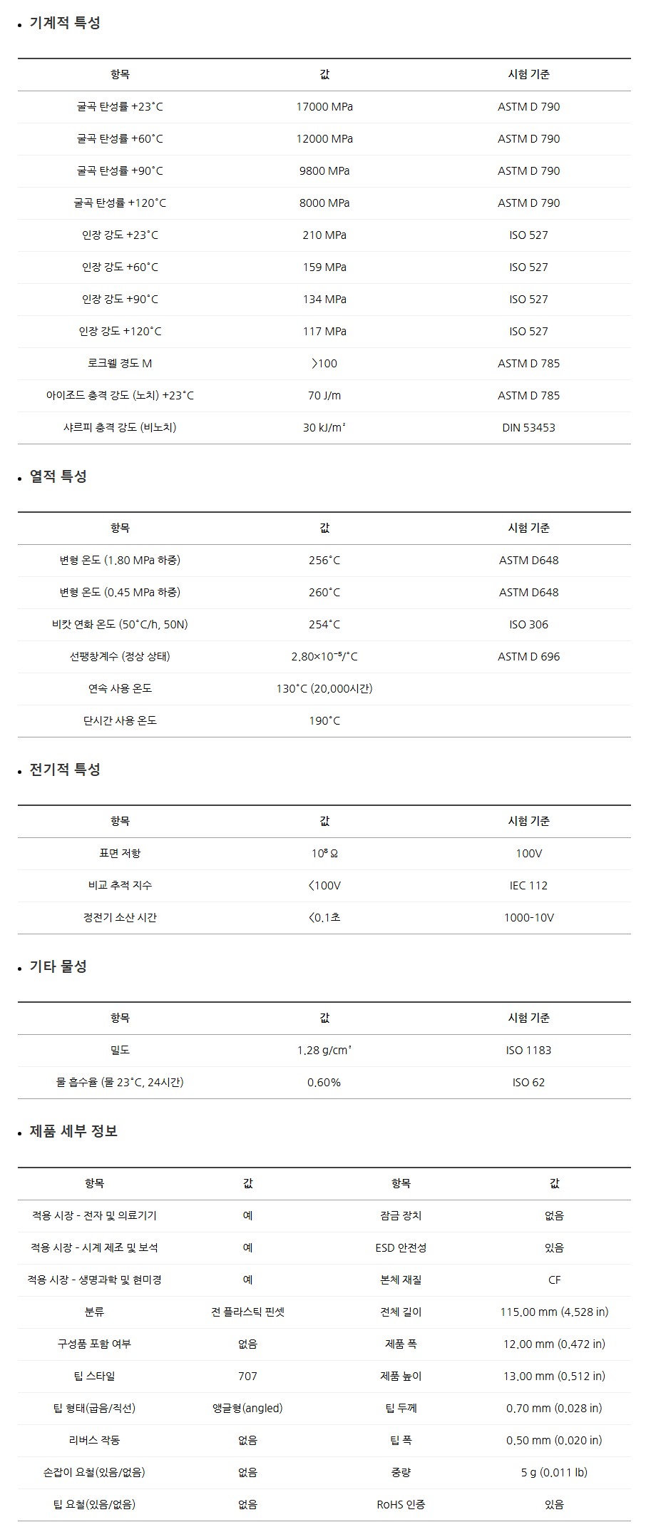 품명 707.CF 카본파이버 ESD 핀셋은 정전기 방지 기능과 높은 강성, 내열·내마모성을 가진 앵글형 정밀 핀셋으로 전자부품 및 실험기기 작업에 적합합니다.