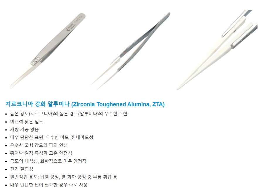 Zirconia Toughened Alumina (ZTA) 소재로 제작된 고강도·고경도 세라믹 팁을 적용한 정밀 핀셋입니다.