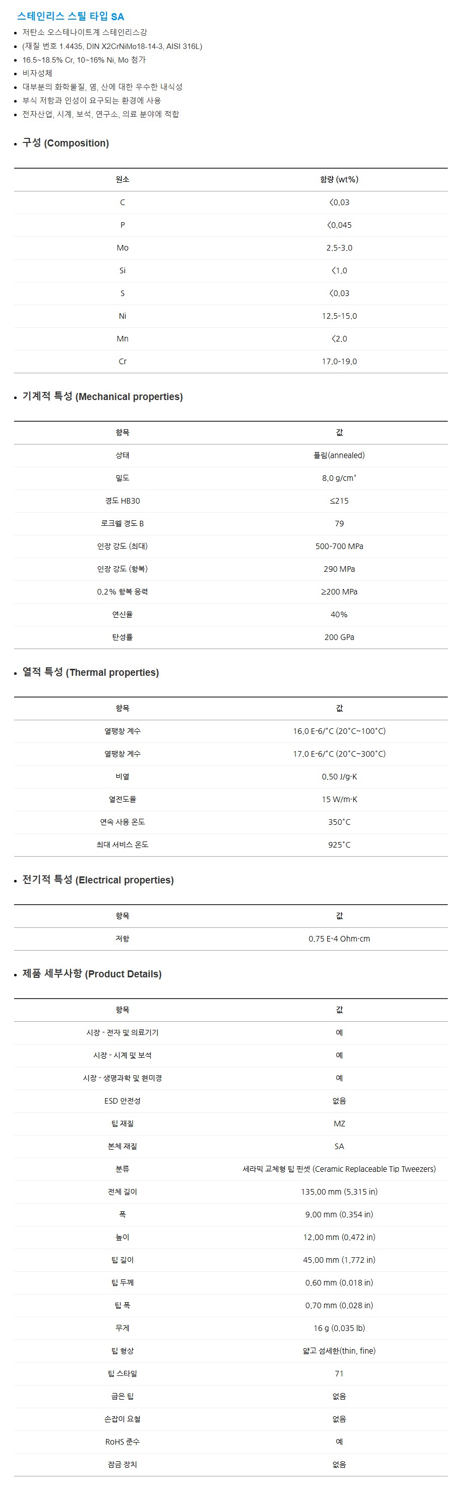 아이디얼텍 교환형 세라믹팁 핀셋 스테인리스 손잡이 정전기방지 실험실용 트위저 71MZ.SA