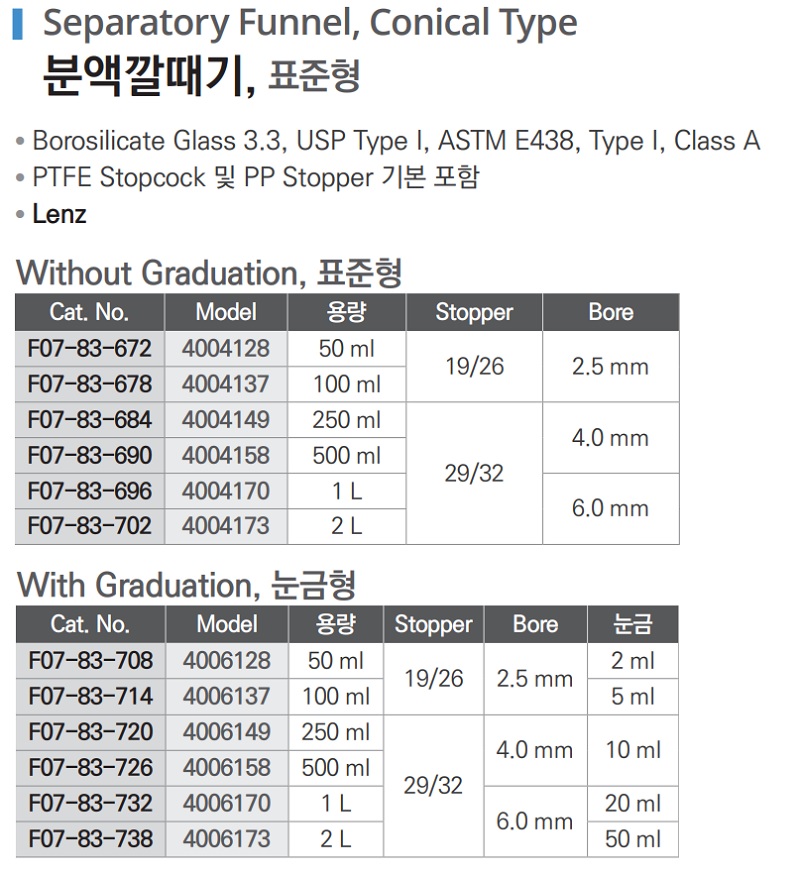 분액깔때기, 표준형 Separatory Funnel, Conical Type F07-83-672