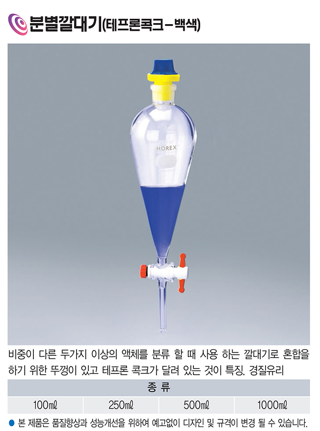 개요 : 비중이 다른 두가지 이상의 액체를 분류할 때 사용하는 깔대기로 혼합을 하기 위한 뚜껑이 있고 테프론 콕크가 달려 있는 것이 특징