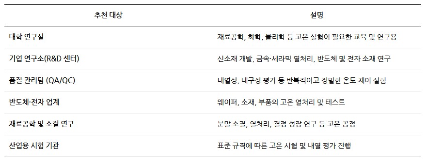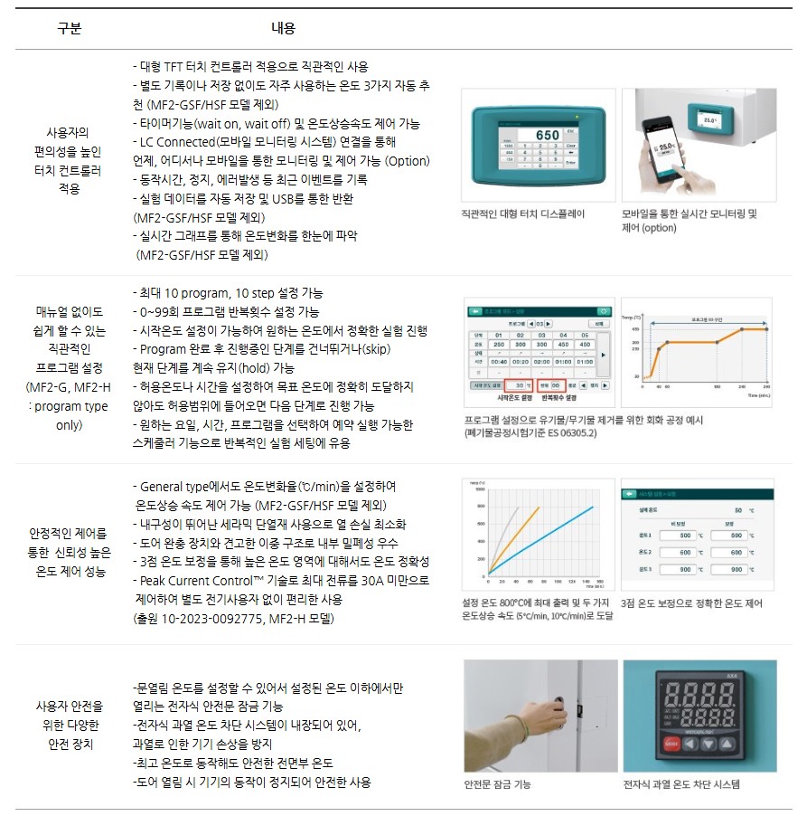 또한, 온도 상승 속도 제어, 자동 대기 기능, 데이터 저장 및 USB 출력 등 다양한 기능을 지원하여 반복적인 실험 환경에 최적화되어 있습니다.
