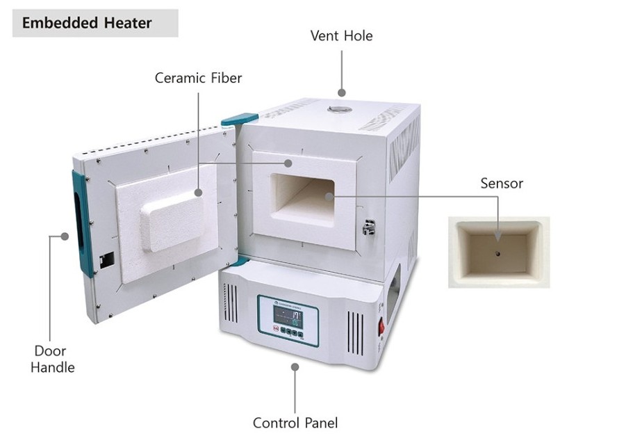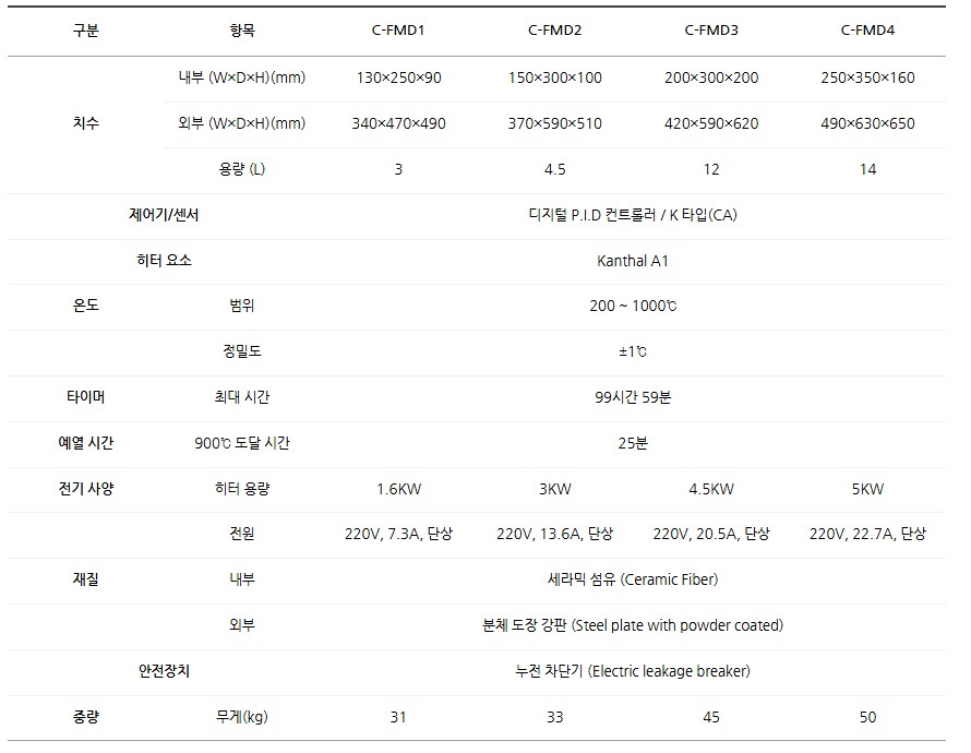 C-FMD 시리즈 챔버형 전기로(Muffle Furnace) 는 Kanthal A1 히터를 사용하여 최대 1000℃까지 온도 설정이 가능하며,