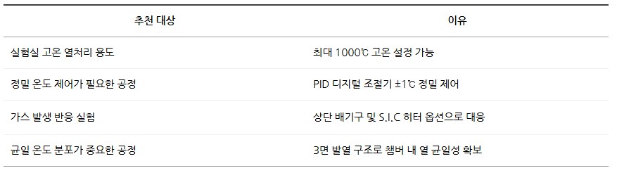 품명 최대 1000도 지원하는 PID 조절기 탑재 챔버형 전기로, 3면 발열 구조와 뛰어난 열보존력으로 정밀 실험에 적합합니다.