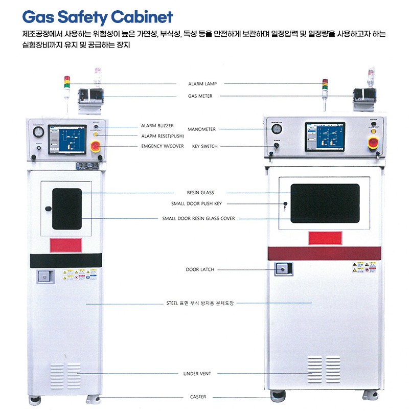 특히 가연성, 독성, 반응성 가스를 안전하게 취급하기 위한 최적의 설비, 국산 인증형 가스 캐비닛 입니다.