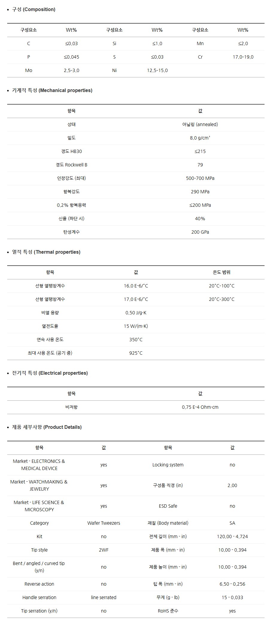 316L 오스테나이트계 스테인리스강(비자성, 내식성 우수)으로 제작되었습니다.