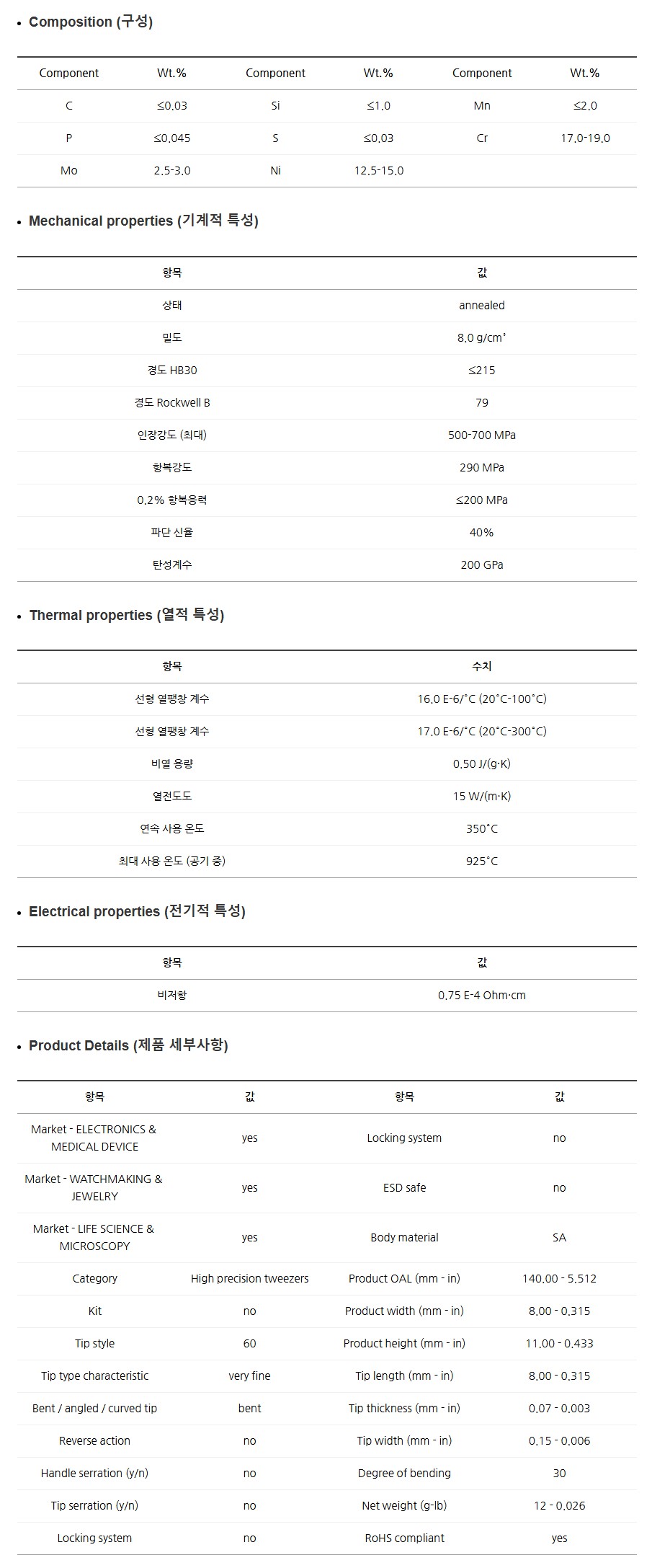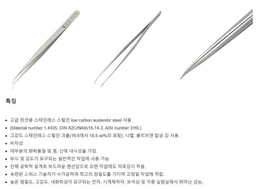 품명 IDEAL-TEK 60.SA 정밀 스테인리스 핀셋. 316L 소재로 내식성, 비자성, 고정밀 설계. 전자·시계·실험실 등 정밀 작업에 최적화된 고급 핀셋입니다.