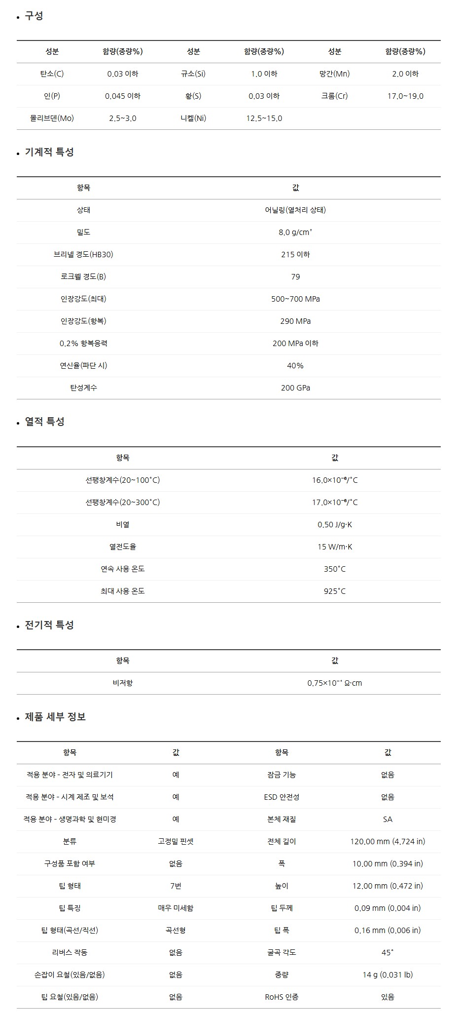 탁월한 내식성과 내화학성을 지녀 산, 염, 용매에 강하며, 미세 조립 및 전자기기·시계제조·보석세공 등 고정밀 작업에 적합합니다.
