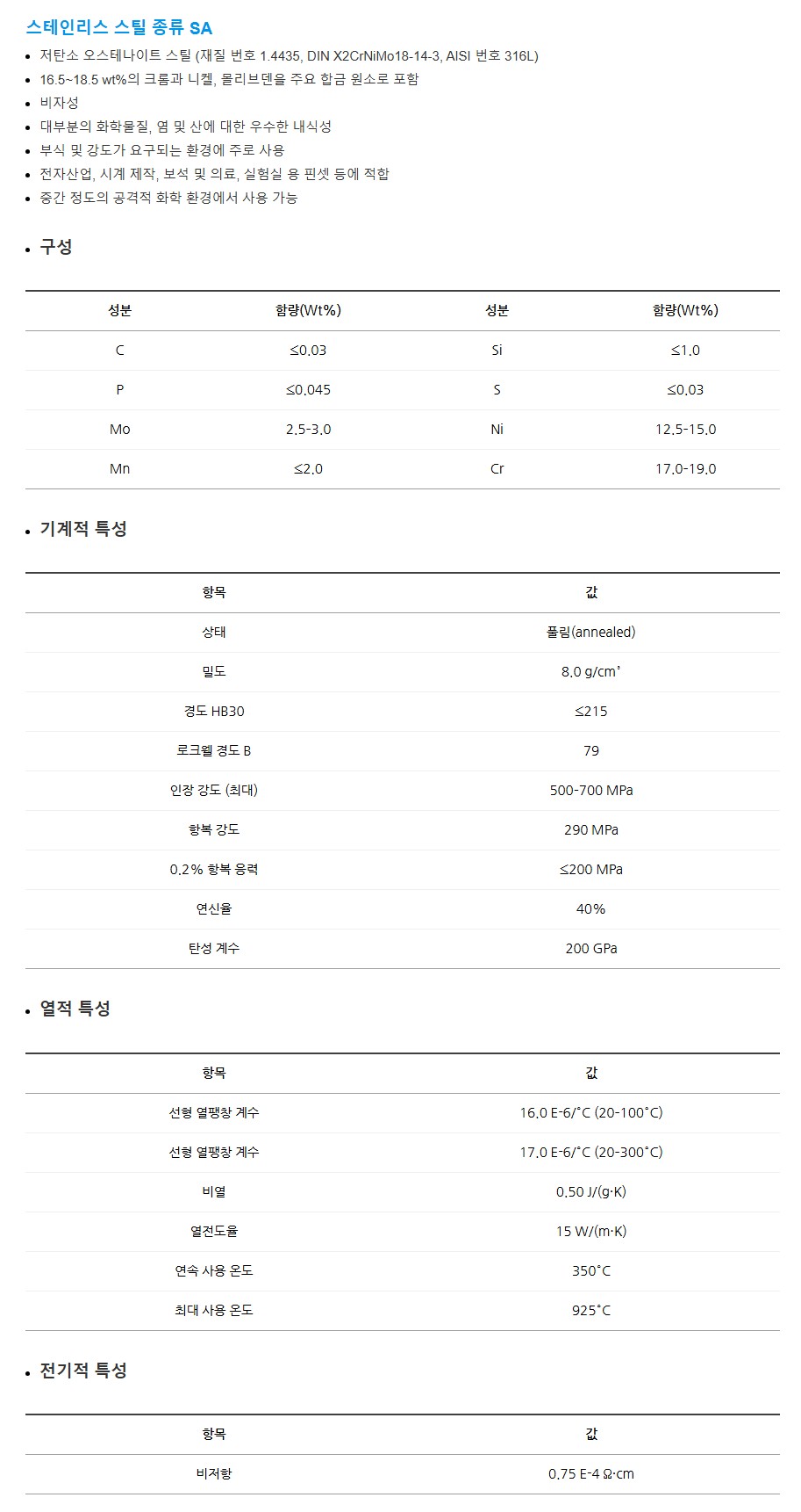 본체는 비자성 안티애시드(anti-acid) 스테인리스 스틸로 내식성과 내열성이 뛰어나며,