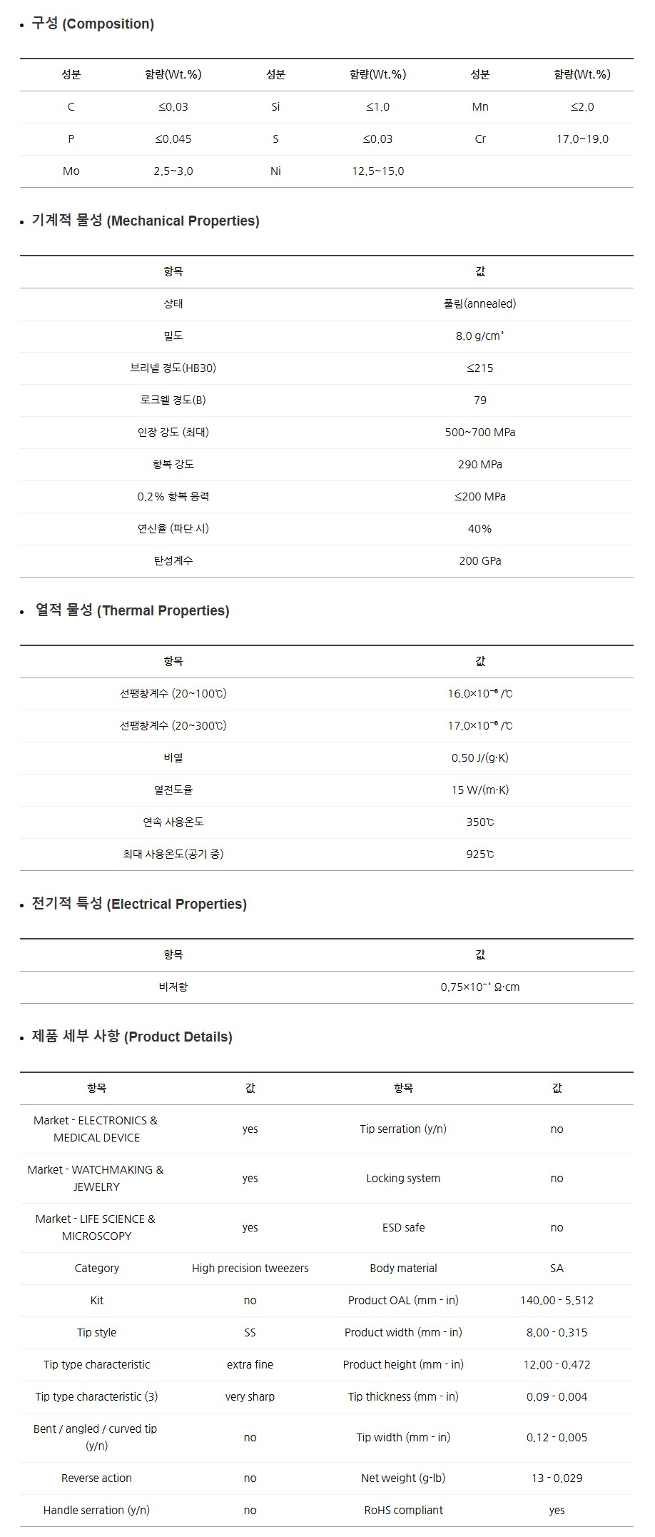 비자성, 내식성, 내화학성이 우수하여 전자, 시계, 보석, 연구소, 정밀 실험 등 세밀한 작업에 최적화되어 있습니다.