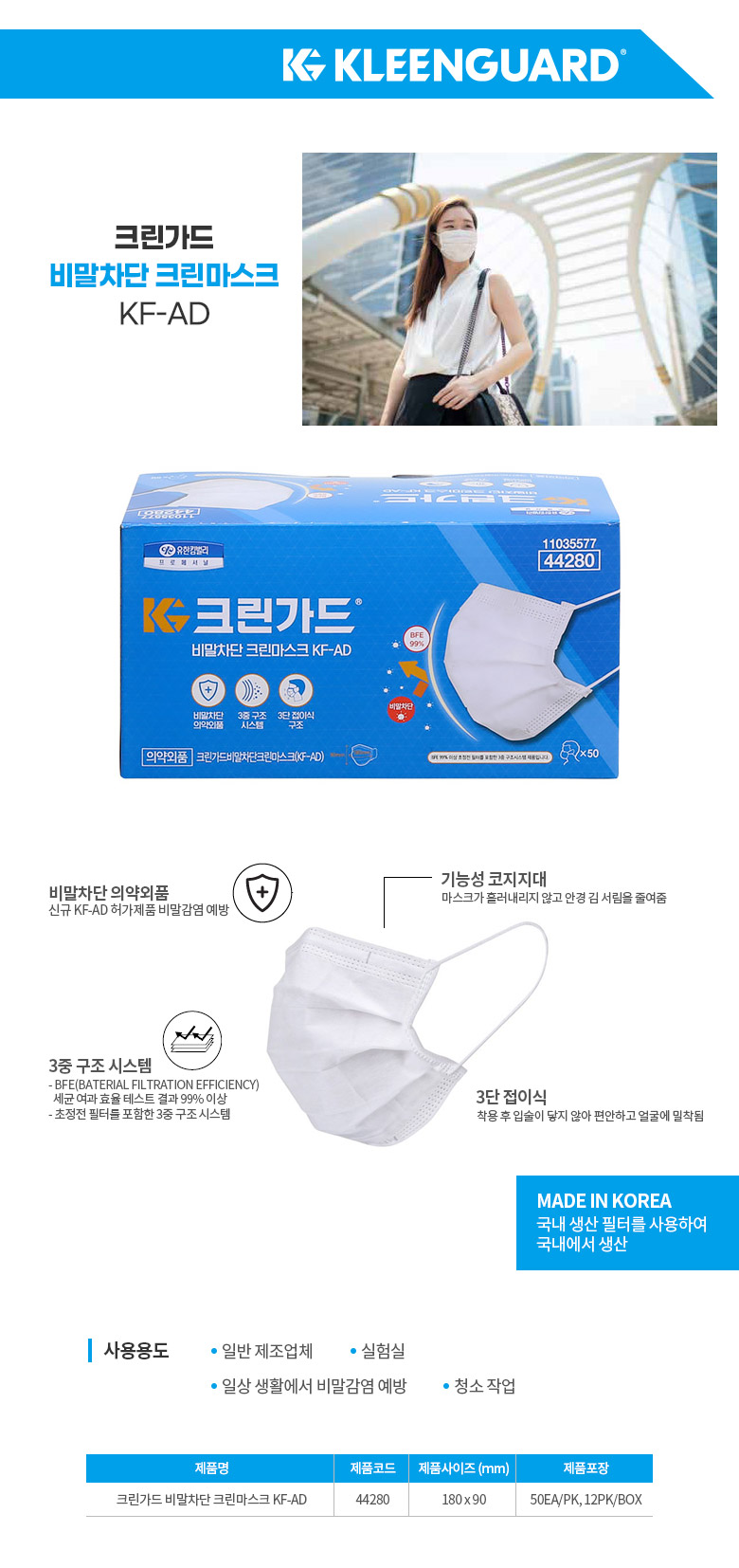 국내산 비말차단 크린마스크 KF-AD 3단 접이식 일회용 마스크 44280