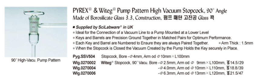 PYREX® & Witeg® Pump Pattern High Vacuum Stopcock, 90° AngleMade of Borosilicate Glass 3.3, Construction, 펌프 패턴 고진공 Glass콕