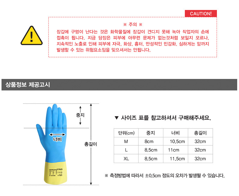 ■유연한 천연고무 재질에 네오프렌 코팅이 되어 내구성 및 내화학성이 강화되었습니다.